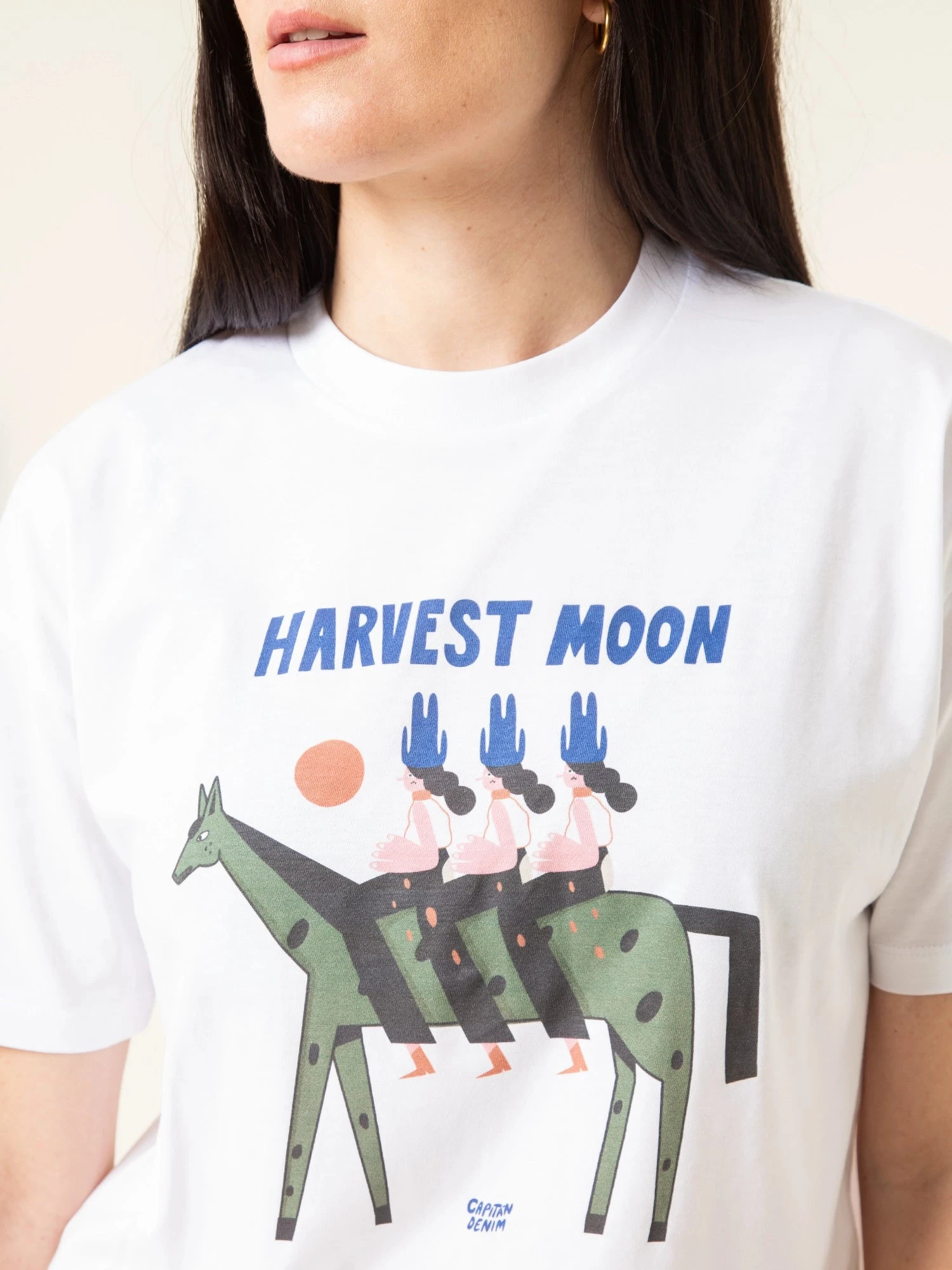 La camiseta Harvest Moon es unisex de algodón orgánico. Es de manga corta oversize y es perfecta para cualquier ocasión. Está diseñada por ilustradores locales, por lo que es una prenda exclusiva de Capitán Denim.